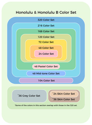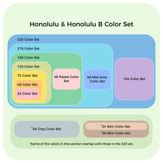 Honolulu and Honolulu B sets have an inclusion relationship. To avoid purchasing duplicate colors, you can choose the appropriate set based on the following inclusion guidelines