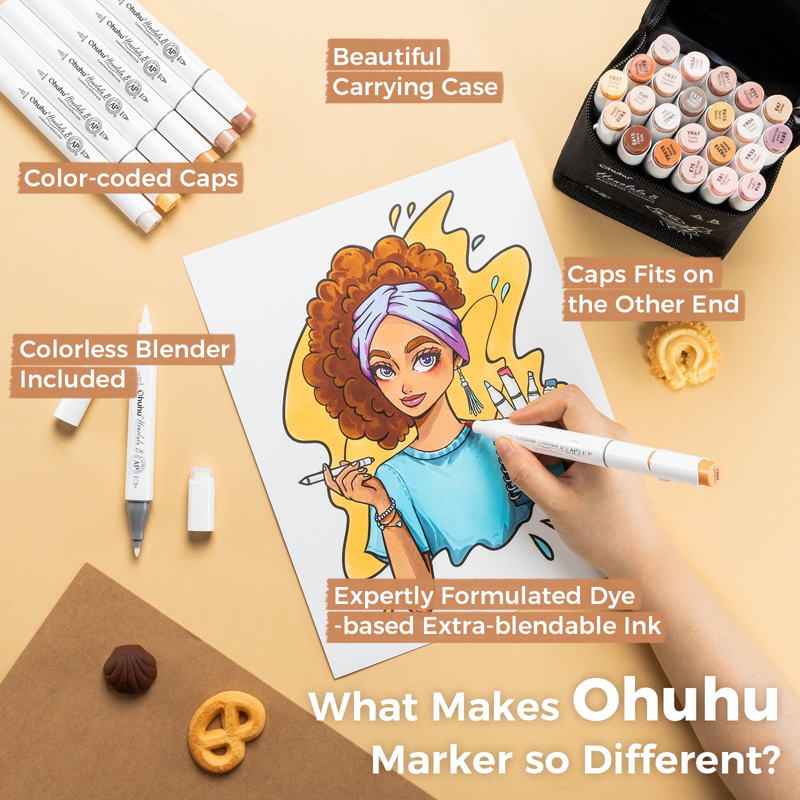 The Ohuhu 24 Skin Tone Marker Pen Set is designed for flesh, face, manga, portrait, illustration, drawing, sketching and other artistic creations. These markers dual tipped with fine tips for detailed lines while chisel-edged tips for wider strokes and easy coverage. The alcohol-based ink is non-toxic, acid-free, and dries in a flash. Besides, the colored caps for hue identification and preventing from volatilization are user-friendly. Also a carrying case keeps all your markers close at hand and convenient for portable use