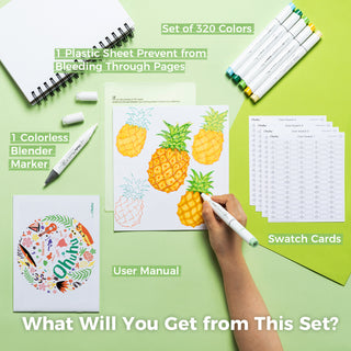 Package Includes: Art Marker Set in A Carrying Case with 320 Unique Colors, 1 Colorless Alcohol Marker Blender, Color Swatch Cards, 1 User Manual & 1 Plastic Sheet for Prevent Ink from Bleeding through