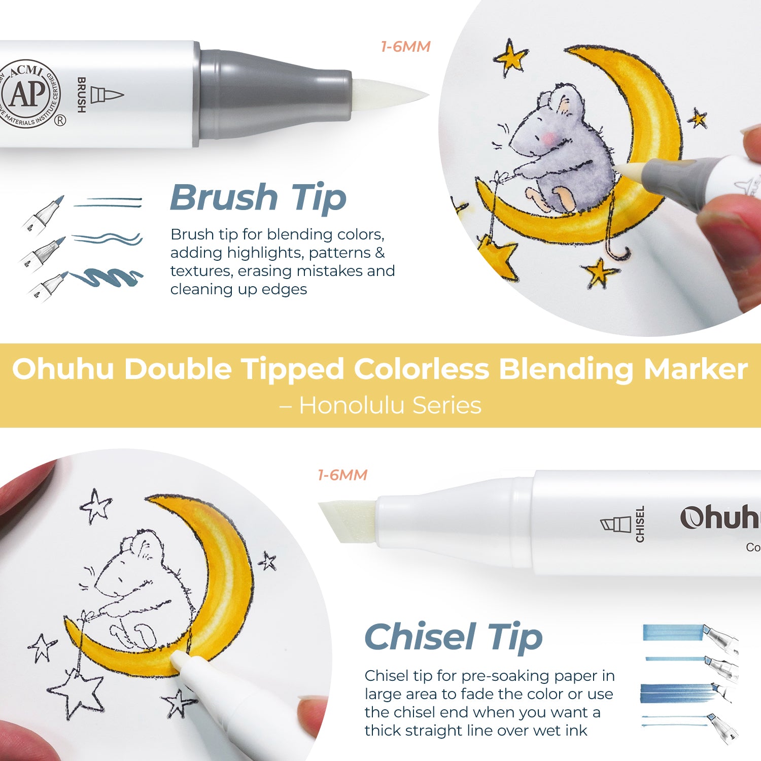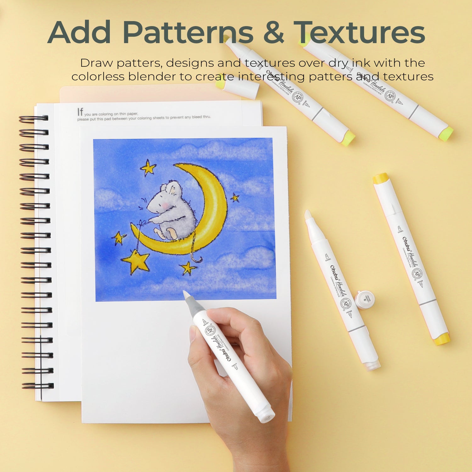 Craft remarkable designs with the Ohuhu Colorless Blender! Achieve endless creative possibilities with this exclusive tool, allowing you to draw patterns, designs, and textures over dry ink for a unique effect, or lift out bright highlights on dry ink or create soft highlights on wet ink for subtle, sophisticated results. Unleash your artistic vision and make your mark with Ohuhu Colorless Blender!