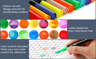 You've never had a marker set quite this diverse. You'll get a huge range of vibrant, highly-pigmented colors. Each set includes primary colors and complementary colors, and blend beautifully for added dimension to your artwork. Each art marker is labeled with a color code. Let your artistry grow with these water coloring pens! And create artwork like you never have before!
